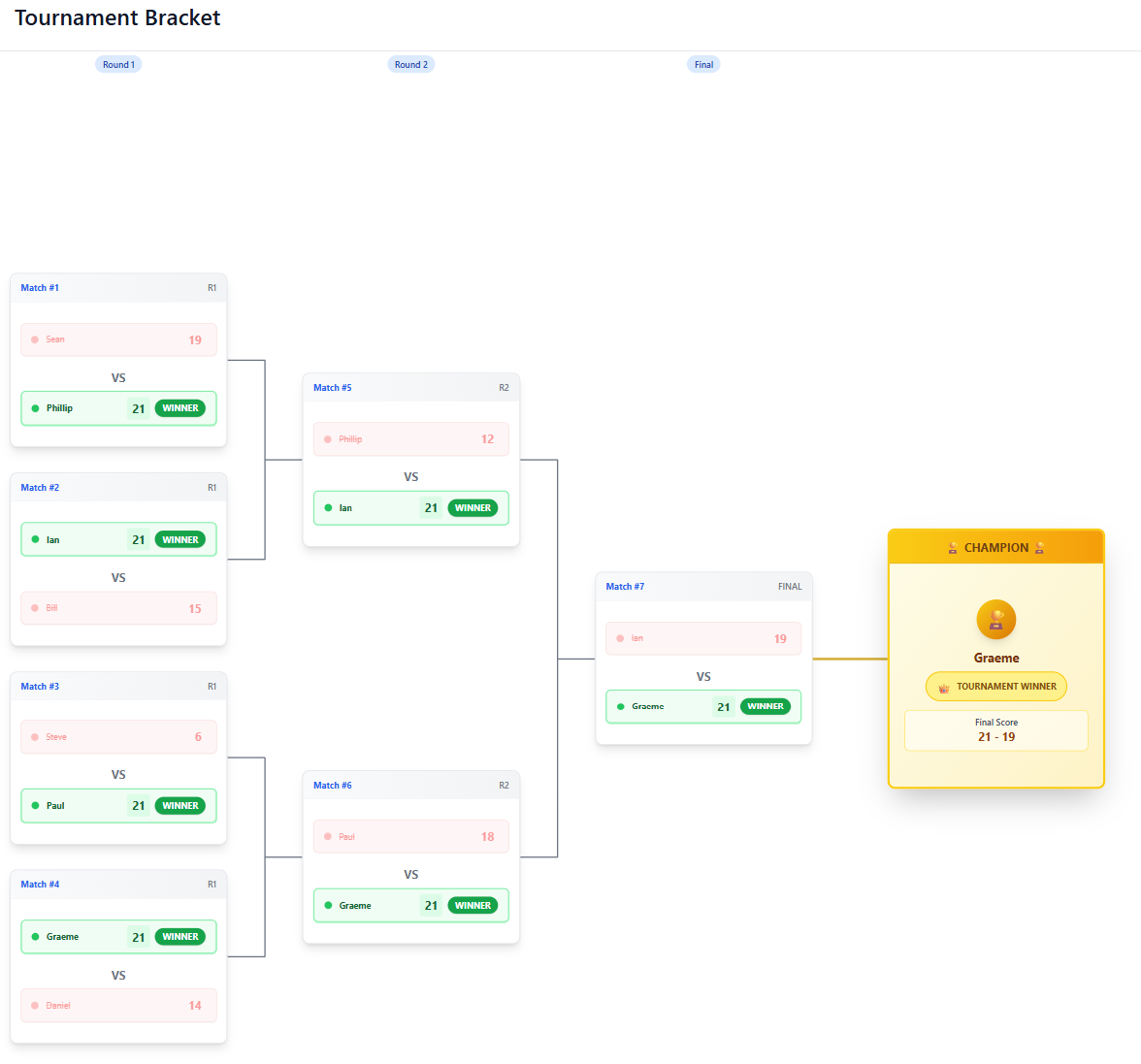 Once running, the system largely manages itself. When a tournament ends, scoring automatically reverts back to event and sponsor displays. Brackets progress in the background, and players are notified of their next matchup automatically.
